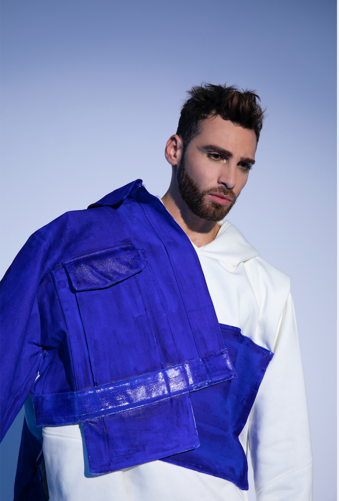 Lors de mes premiers tests, j'ai remarqué que le pigment entraînait la rigidification de certaines de mes pièces, donnant ainsi : un style structuré à la collection. En ce qui concerne les volumes, j’ai décidé de créer des pièces à l’aide de tissus "looses" et "décontractés", tel que le molleton, pour donner un côté plus "streetwear". J'aimais ce contraste : les vêtements rigides représentent pour moi les moments difficiles, les problèmes que nous sommes amenés à rencontrer au quotidien VS la légèreté, la paix et la pureté des vêtements "looses".